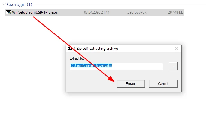 У даному випадку нам допоможе чудова програмка WinSetupFromUSB та кілька додаткових жестів. Першим ділом звантажуємо програму і запускаємо. Вона запропонує розархівувати себе – вказуємо куди і тиснемо кнопку Extract: