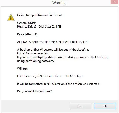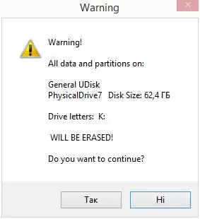 А таке повідомлення у мене з'явилося у зв'язку з тим, що перед тим моя флешка була форматована у системі NTFS. При зміні файлової системи власне й з'являється схоже віконечко із попередженням.
