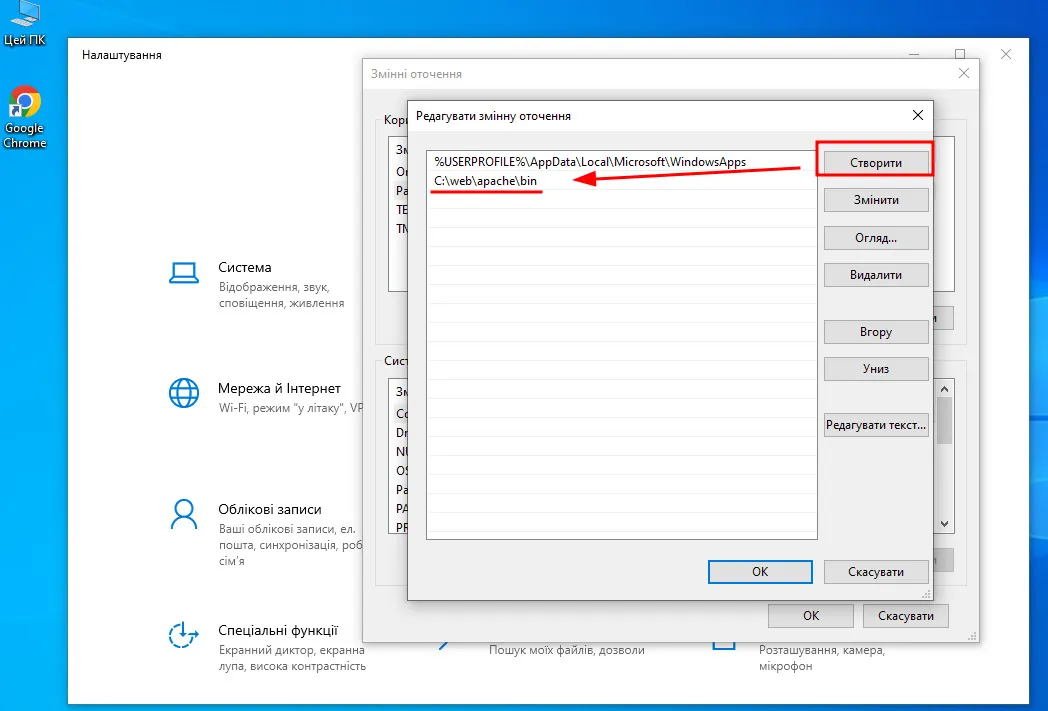 Таким чином ми зможемо викликати команди для запуску та зупинки сервера без вказування повного шляху до файлу, а просто через httpd.exe.
