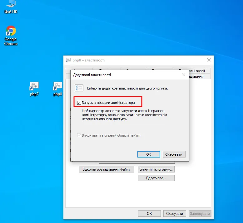 Тепер створюємо ярлики для виществорених скриптів, наприклад, просто на робочому столі, і у властивостях ярликів виставляємо запуск від імені адміністратора: